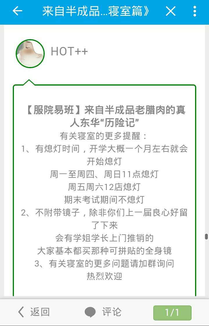 服装学院易班发展中心学生团队策划了迎新主题的系列话题,以“来自半成老腊肉的真人东华‘历险记’”为主题,生动幽默地介绍学院特色、易班资源、校园生活等信息,让新生提前了解大学生活。系列话题包括易课堂番外篇、DHU介绍篇、饮食篇、学习篇、寝室篇、娱乐篇、到校路线篇、地铁公交篇等几大主题,篇篇内容丰富,语言极为生活化,并配有详细的图解,完全符合95后阅读审美。