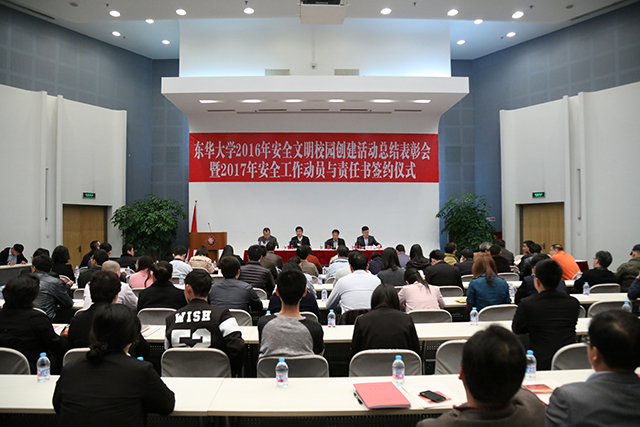 金海燕代表学校作2016年安全工作总结报告,并代表学校与各学院代表签订了2017年安全工作责任书。李永智宣读2016年安全文明单位和先进个人名单。