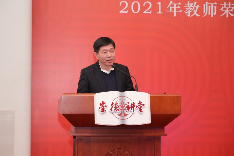 荣休教师代表、“全国先进工作者”、化学化工与生物工程学院教授阎克路在发言中动情回忆从教四十年来深耕教学和科研工作的点滴,“我的梦想就是上好一门课、编好一本教材,这是高校教师的初心,也是我们神圣的职责”“今天,我退休了,我将继续努力,做一名活到老、学到老的新时代退休教师”。“以吾辈之青春,赓续东华之荣光”“在‘为学’上当表率、在‘为事’上当典范、在‘为人’上当楷模”,服装与艺术设计学院青年教师张鑫、人文学院专职辅导员穆莉代表新教职工发言,许下为党育人、为国育才的郑重承诺。2021年教师国情教育研修班学员代表、化学化工与生物工程学院特聘研究员宣为民在发言中表达了作为高校教师和科研工作者心怀“国之大者”、深怀爱国之心、砥砺报国之志的决心。